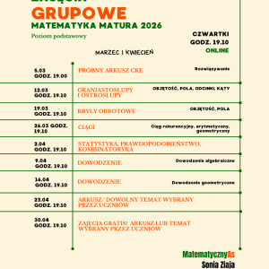 Zajęcia grupowe online dla maturzystów – 4h w miesiącu MARZEC z notatkami PDF i nagraniami spotkań. W grudniu sprawdzisz swoją wiedzę na próbnej maturze.