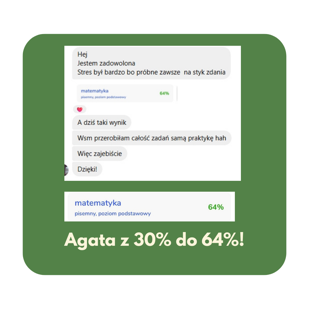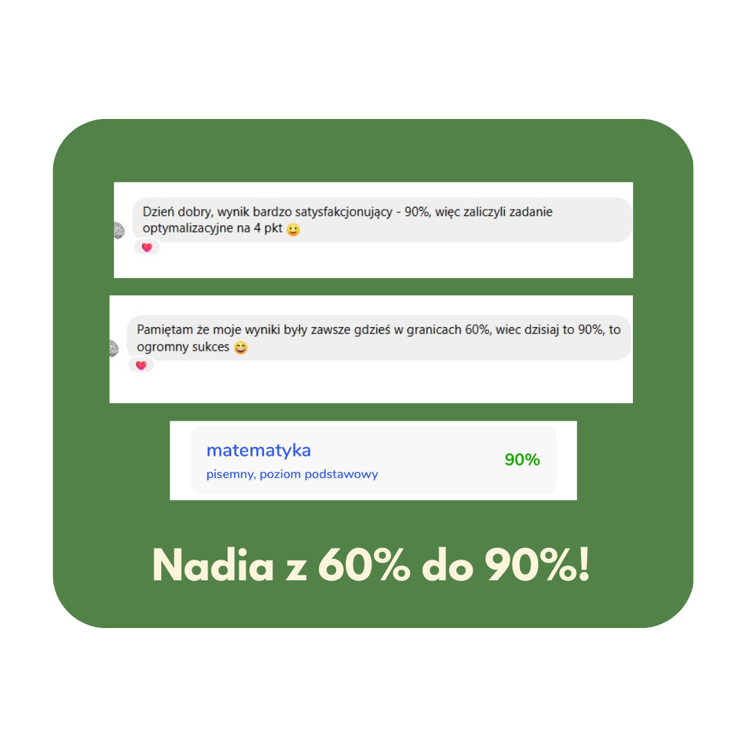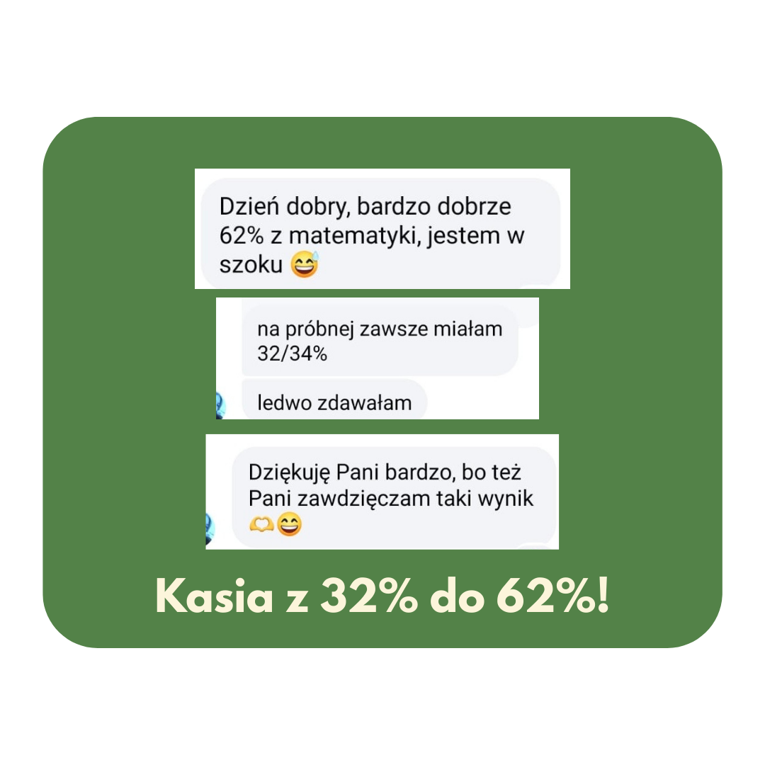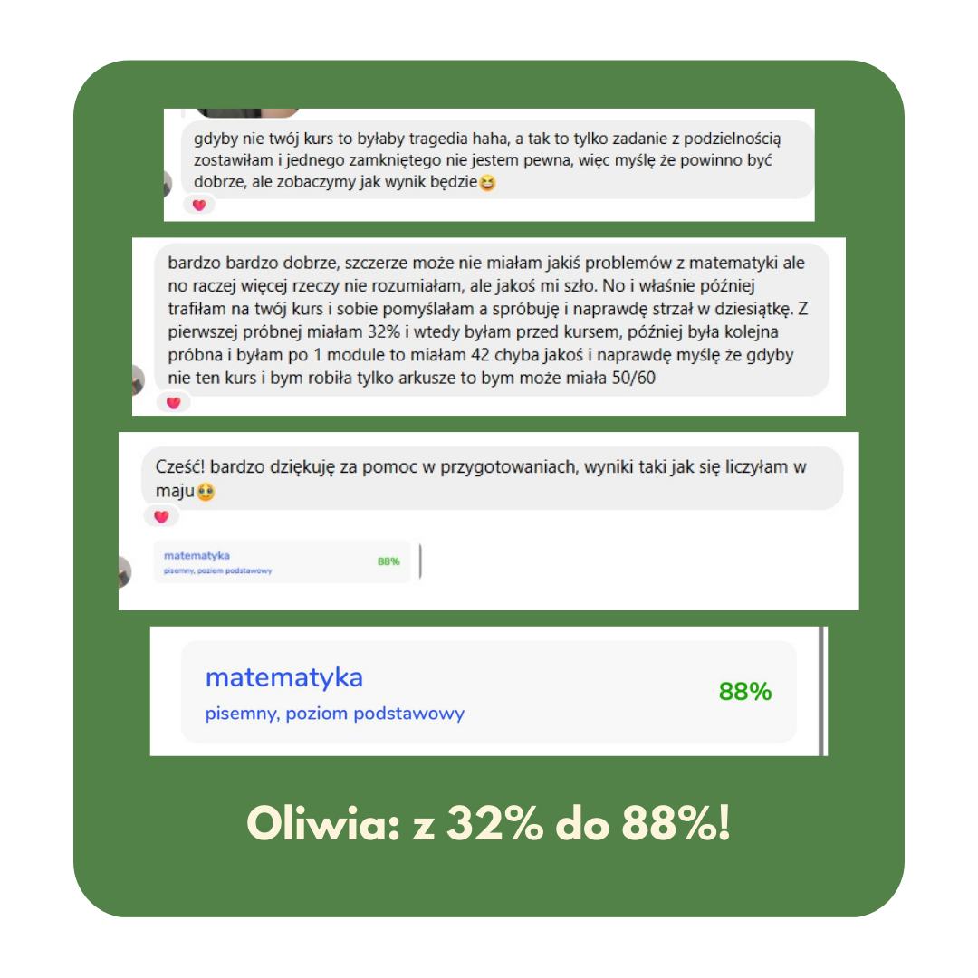 Ten program powstał, bo przez 11 lat pracy z uczniami widziałam jedno: większość z nich nie zdaje nie dlatego, że są „słabi z matmy” – tylko dlatego, że nikt im nie pokazał, jak się jej skutecznie uczyć. Pamiętam Oliwię – przyszła do mnie z 32% na próbnej i przekonaniem, że nigdy tego nie ogarnie. Po 1. module programu miała już 42% z próbnej i wreszcie powiedziała, że to wcale nie takie trudne I chce więcej! Wskoczyła do 3. modułu i w maju wykręciła wynik 88%!