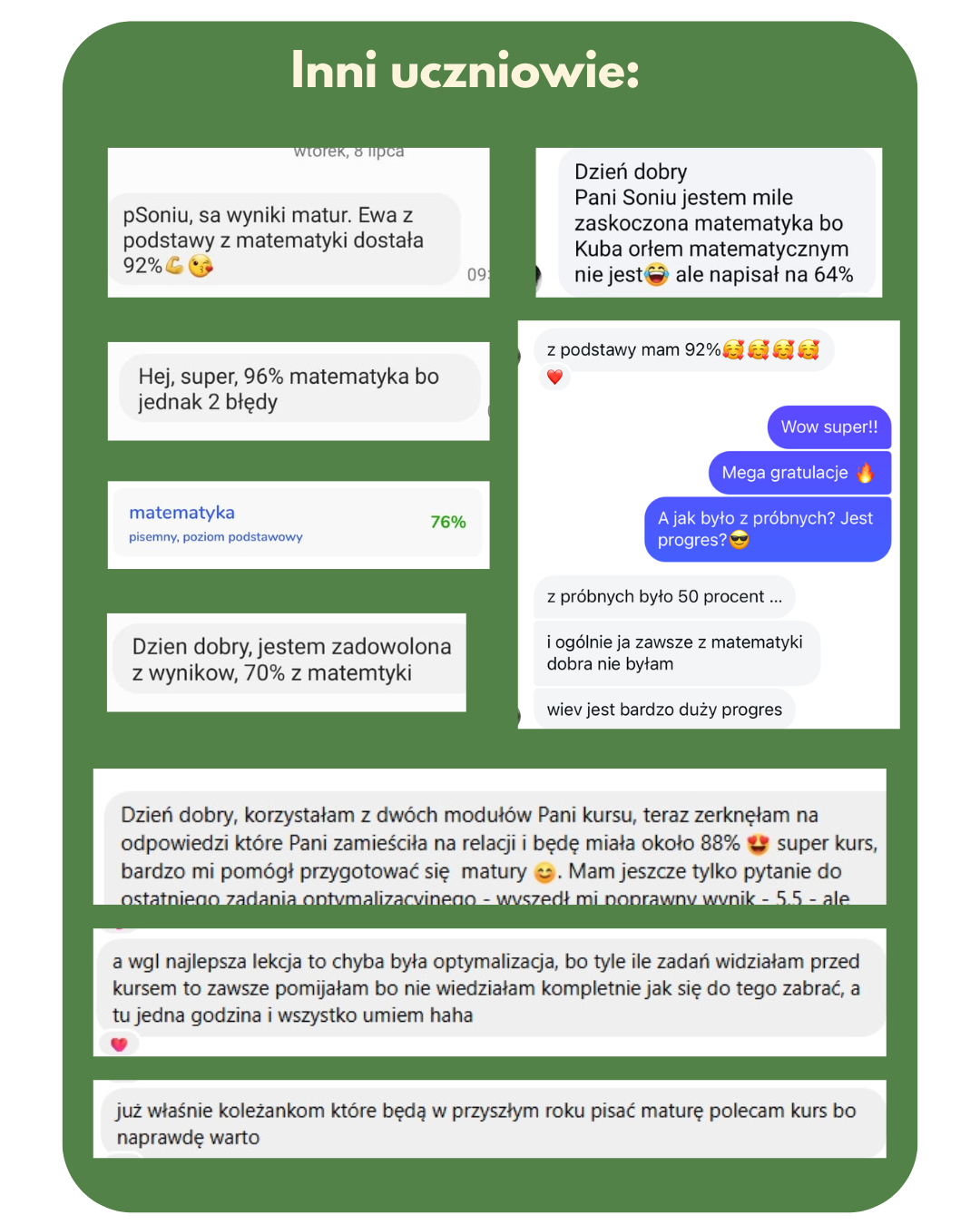 Dołącz do uczniów, którzy zamiast błądzić po omacku, odkryli jasny system nauki – i dzięki temu doszli do pewnych 80% bez korków 3x w tygodniu i bez ciągłego pytania: „Od czego zacząć?”.